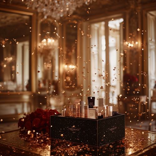 large box with multiple beauty products, gold confetti falling, out of focus beautiful ornate gold room with large mirrors and chandelier in background warm light, red flowers, festive --style raw --v 6.1 --s 250