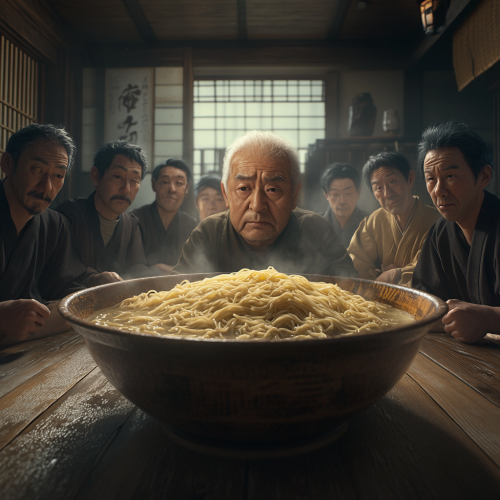 In a realistic scene, a gigantic bowl of noodles sits in the center, with the face of a middle-aged Japanese man embedded within it. The noodles have a realistic texture and detail, appearing vibrant and lifelike. The setting is a traditional Japanese kitchen, warmly lit, featuring wooden elements and traditional decor. Surrounding the bowl are realistic middle-aged Japanese men and women, dressed in casual yet neat clothing, all kneeling in apology while gazing at the noodles. Their expressions are serious, conveying a sense of remorse. The atmosphere is warm and inviting, emphasizing the vibrant colors of the noodles and the tense nature of the scene.