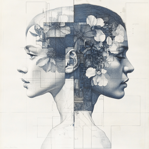 Incredibly detailed technical diagram of the profile of a woman and man who look each other in the face, with the top and back of her head split into complex geometric shapes and flowers growing from the shapes, Chiaroscuro lighting, White background, blue fine intricate details --v 6.1