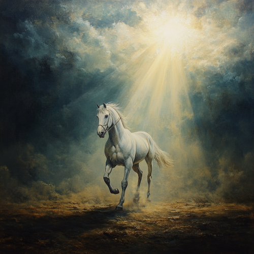 imagine um quadro do apostolo Paulo durante o momento que estava sobre seu cavalo quando viu uma grande luz nos céus que o deixou cego e o derrubou do cavalo. O apóstolo Paulo estava a caminho de damasco. Crie um quadro desta pintura como uma obra de arte com pintura a óleo e alta qualidade, com detalhes de luz e sombras.