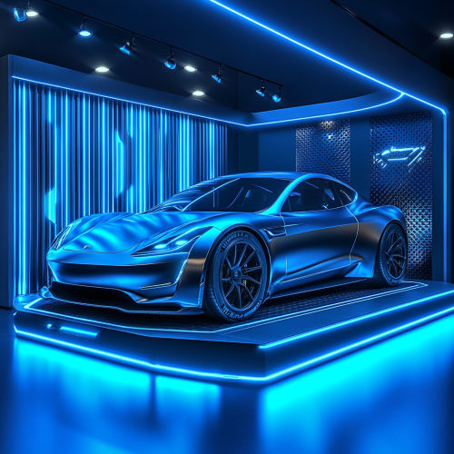 Một gian hàng trưng bày ô tô 3D hiện đại với một chiếc xe điện, tông màu xanh dương chủ đạo. Thiết kế gọn gàng và tương lai, với đèn LED xanh dương và các đường nét sạch sẽ làm nổi bật chiếc xe. Hình nền bao gồm các hình dạng trừu tượng và đồ họa hiện đại với các sắc thái của xanh dương và bạc, tạo ra một bầu không khí công nghệ cao. Bệ trưng bày ô tô được chiếu sáng nhẹ nhàng bằng ánh sáng xanh dương, và toàn bộ gian hàng mang lại cảm giác chuyên nghiệp, sáng tạo, phản ánh tính bền vững và tương lai của ngành công nghiệp ô tô. --v 6.1 --s 250