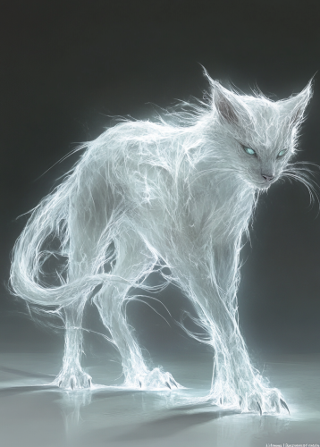 A sleek, feline creature with a body that shimmers and changes color based on the surrounding light. Its fur looks like shifting mist, making its outline difficult to distinguish. It has elongated, graceful limbs with delicate, crystalline claws that glint in the light. Its face is sharp and angular, with reflective, mirror-like eyes that capture and reflect entire landscapes. Glimpsebeasts seem to disappear and reappear as they move, as though they slip between realities, fantasy art style --ar 63:88