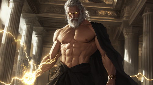 Zeus stands in a grand, shadowy hall with marble columns, his black robes open slightly to reveal a chiseled chest. His hand rests on a glowing lightning bolt, and his eyes are calm and confident. The soft flashes of lightning highlight his powerful physique and divine authority, creating an aura of strength and allure --ar 16:9