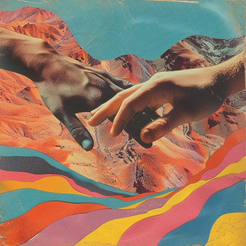 tripsitter, trip guide, retreat guide, non-realistm, creative, colourful, minimal, powerful, holding hands, safe, halftone paper collage style, --v 6.0