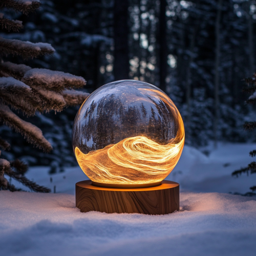 A glowing sphere filled with gently swirling snow inside, mounted on a turned wood base, sitting on powdery snow at night in a pine forest. :ar 16:9 --v 6.1