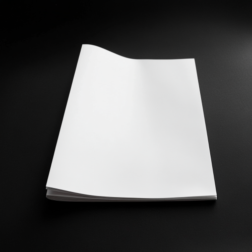 Long white white brochure neck-up, black background, strong contrast light, simple and clean image, no neediness, no other elements than paper and background.