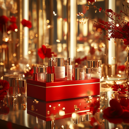 large red box in spotlight with multiple beauty products in front, evening, abstract ornate gold room with large mirrors in background, gold confetti falling, warm light, red flowers, festive --style raw --v 6.1 --s 250