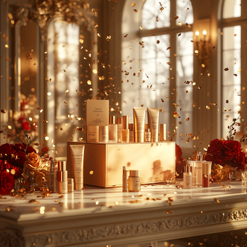 large box with multiple beauty products, gold confetti falling, out of focus beautiful ornate gold room with large windows, evening in background warm light, red flowers, festive --style raw --v 6.1 --s 250