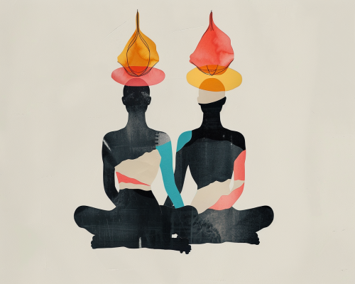 tripsitter, trip guide, retreat guide, two people sitting together, colours and shapes coming out of one head, other head grounded, non-realism, creative, minimal, powerful, holding hands, protecting, safe, halftone paper collage style --ar 5:4 --v 6.0