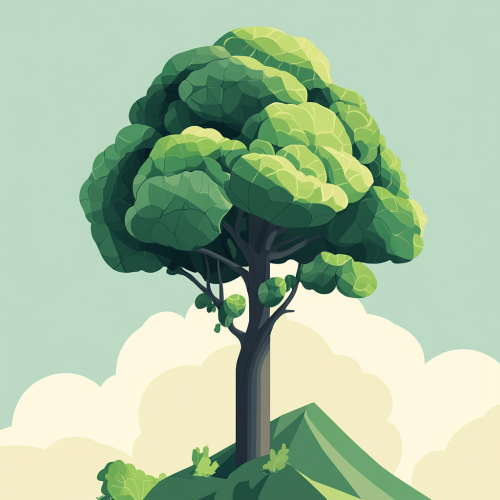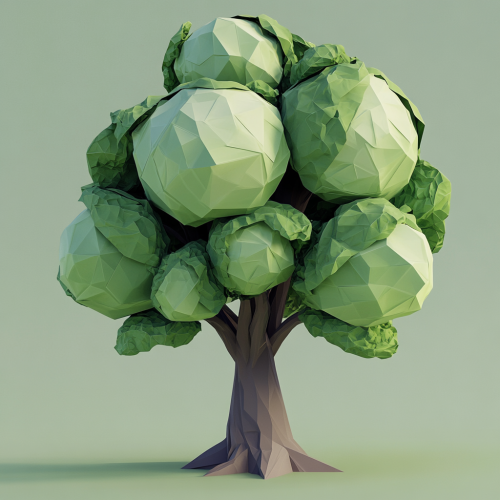 low poly video game tree with huge cabbages on it The style embraces simplicity and consists only of geometrical shapes A lot of focus is put into shapes, materials, and lighting to make up for the absence of textures