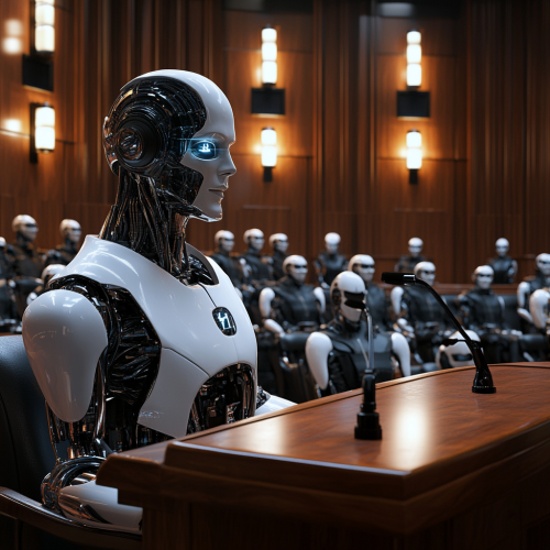 you are a fashion photographer, take a highly realistic photo of a cyborg robot attorney addressing a 12 person jury in a courtroom made up of cyborg robots. Vector rendered and 3d style