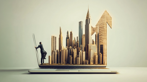 a photo realistic scene of an open laptop showing a marketing chart. The laptop is open in the foreground and 3D city buildings are shooting out from its screen. The buildings are made of marle stone and the architecture is arrow-like. The arrow shaped buildings represent market share in a 3D graph. A mountaineer dressed in a business suit is climbing up the side one of the buildings using a thich braided climbing rope. --ar 16:9