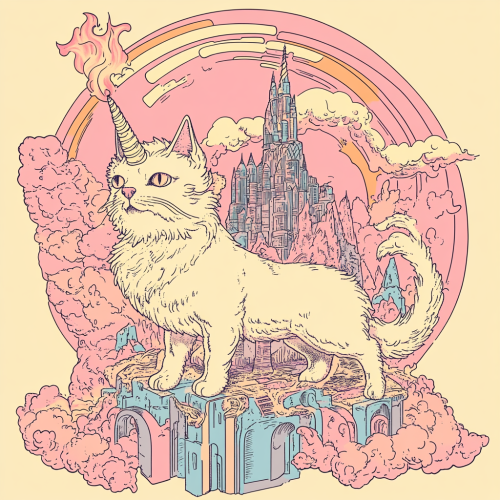 a t-shirt design using 4 colors with a unicorn cat, light pink, include fire, used for a heavy metal album, with a greek mythical castle, in the style of Keith Haring