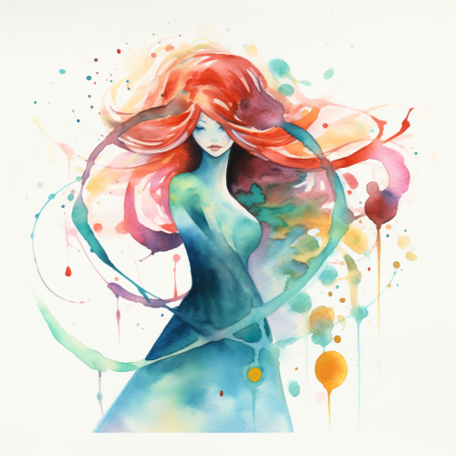 an abstract colorful watercolor painting depicting a character representing the sign virgo, on white background
