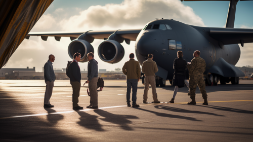 five people gathered on an airport runway around talking near the open aft cargo door of a C17 Globemaster. Photorealistic, Canon EOS R5, f 1.2. --ar 16:9