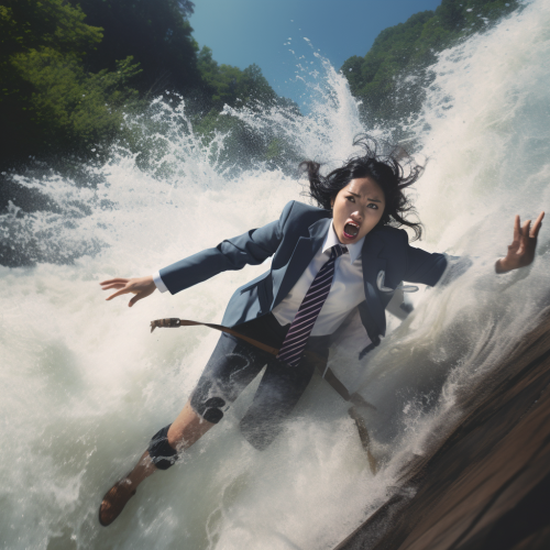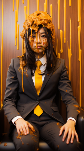 Japanese woman covered with a large amount of curry sauce on her head while wearing a business suit --ar 9:16
