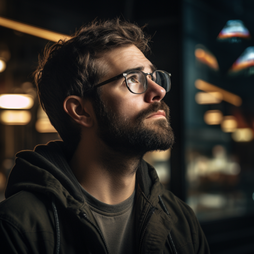 a man who works in digital marketing, contemplating a decision, 50mm lens