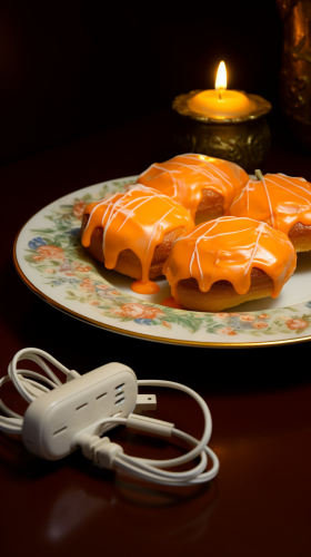 A super-powerful electric apricot with eclairs on a plate. RJ45 socket in the apricot to plug in a network cable. --ar 9:16