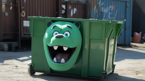 a green dumpster with a grizley bear smiling sitting in the dumpster, white back ground, --ar 16:9