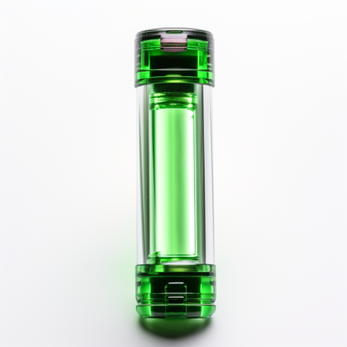 a photograph of a test tube that smoothly transitions into a leaf at the top end, symbolizing the fusion of chemistry with nature. Surround the test tube with small icons representing the water cycle, air filtration, and soil remediation. Colors should predominantly be green and blue, denoting Earth's natural resources, contrasted by subtle gold accents to represent the value and importance of these resources. --ar 3:2