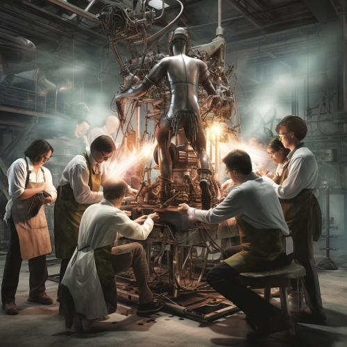 people constructing humans in a factory, assembling the human limbs onto a human model, less busy background