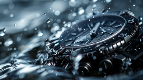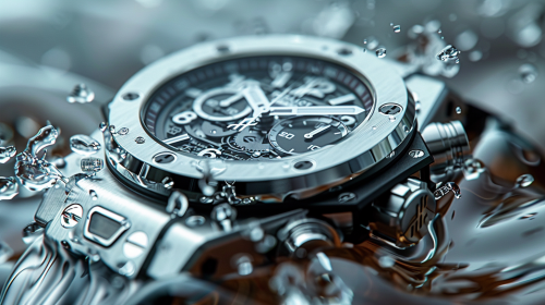 A luxury watch in the style of Hublot, floating in mid-air, dissolving into water droplets as it breaks apart. Each droplet reflects light dramatically, creating a high-contrast scene. The background is a gradient of dark and light grays, adding depth and a super-realistic 3D effect. The watch’s details, like its sleek metallic parts, are still visible as it transforms into water, with light casting sharp highlights and deep shadows. --ar 16:9 --v 6.0 --stylize 700