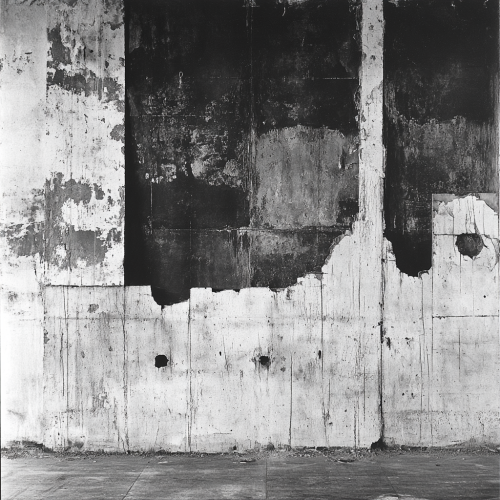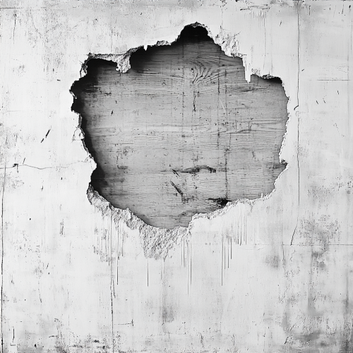 large interior wall, faded paint over lathe and plaster of paris, print design, rustic, black & white image, multiple non uniform holes in wall exposing wood horizontal wood lathe, large format, busy print, very detailed, spackle and paint layers