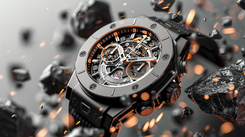 A luxury watch in the style of Hublot, floating in mid-air with pieces of rock orbiting around it, set against a gradient gray background. The watch has a sleek, modern design with intricate details, contrasting metals, and a high-tech, futuristic look. Light plays off the surface, casting deep shadows, and the rocks are illuminated with subtle highlights. The overall scene has a super-realistic 3D effect with dramatic lighting, creating a sense of depth and luxury. --ar 16:9 --v 6.0 --stylize 700