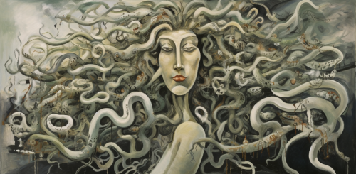 A painting of Medusa, with long, curly hair made from serpents and pearls, in the style of Yves Tanguy's abstract expressionism. --ar 39:19 --v 5.0 --s 750