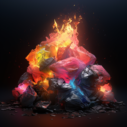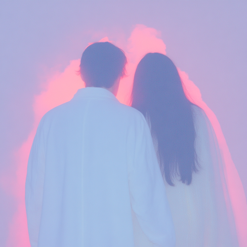 A photo of a young lover couple walking into a burning sea, huge flames on sea, dramatic photo, shot from behind. one man and one woman They wear colorful clothes, surrounded by flying white birds with burning wings. The scene is captured with film. Lovers walking towards flames, a love and fire theme, during sunset with a slightly darkened sky, with lens flare --chaos 22 --ar 1:1 --sref 2959860992 --personalize 7pfsx2n --sw 25 --stylize 1000 --v 6.1