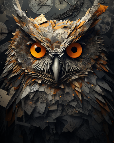 bold stamped text, papaer owl, cream and pebble gray and orange, lettercore, surreal, witchy, papaer collage background, glitterpunk, volumetric lighting, 3d, professional photography, uhd --ar 4:5 --s 250 --style raw
