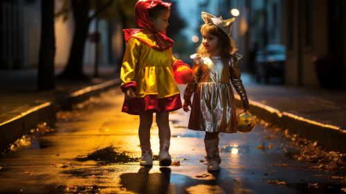children on street, halloween, Alice in wonderland costume, happy, in distance, primary colours, realistic, detail-oriented, light reflections, Chiaroscuro, --v 5.2 --style raw --ar 16:9