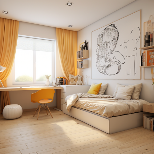 draw a photorealistic design project for a children's room in a modern minimalist style in light colors