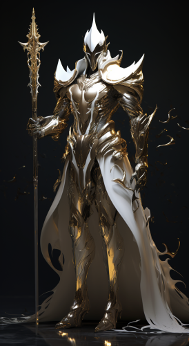 a man dressed in gold armor with gold scepters, in the style of ross tran, sketchfab, light white and dark silver, precision in details, dark bronze and white, layered surfaces, changelingcore --ar 45:82