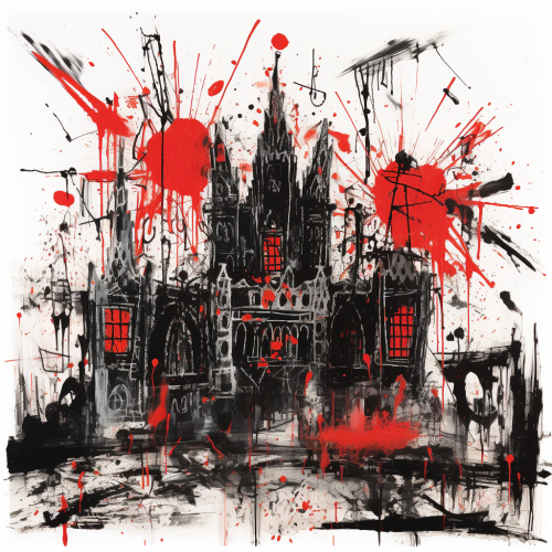 A chaotic, punk-style gothic castle, red blots, in the style of Jean-Michel Basquiat