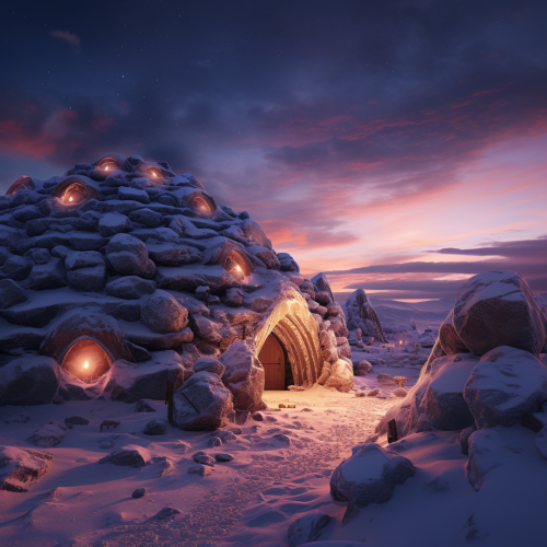 igloo in the tundra of the far north, halloween, Perfection, art by thomas kinkade, Cinematic moody evening, high wide angle, Ultrarealistic, Photorealistic, Octane Render, 8k, Intricate Detail
