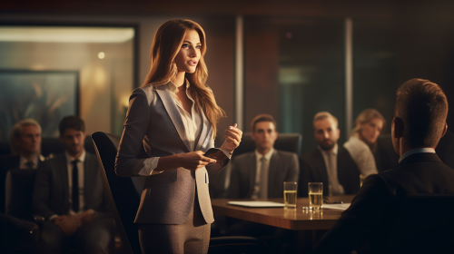 the most interesting woman in the world giving a powerful presentation to a board room full of woman and men industry titans ultra luxury scene. cinematic photo realistic --ar 16:9