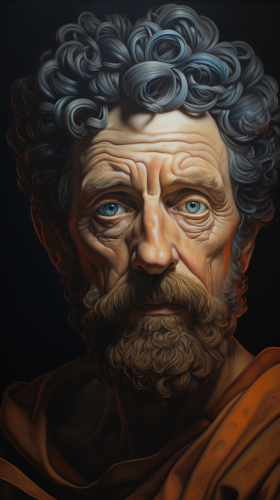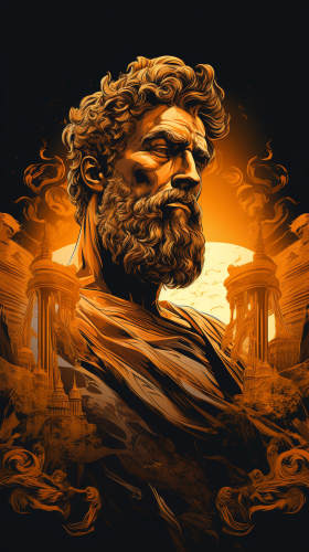 Marcus Aurelius, bottom up imposing view, a wise face looking at the horizon, and behind it something that represents values, precepts, like a golden rule to follow, which is his legacy, hyper realistic, --ar 9:16