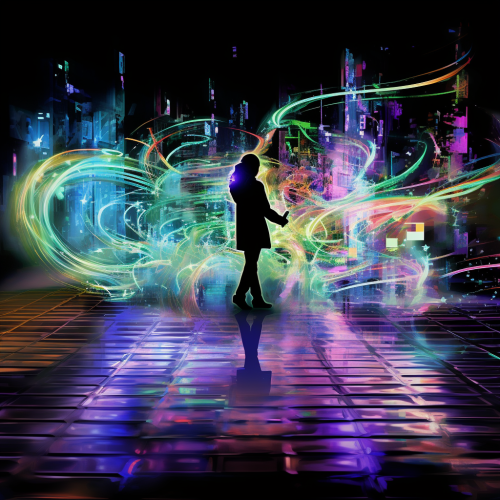 A man is watching over himself from outside of his body so he doesn’t make the wrong decision. He is the observer of his own mind rather than the perception that he views reality from., kaleidoscopic, Classicism, Glowwave, ultra wide-angle, Texturing, Grainy, Virtual reality, iridescent colors, steampunk, anamorphic lens flare lighting, Ultra-realistic, highly detailed, natural lighting, ocean environment, Unity engine, 8k --ar 1:1
