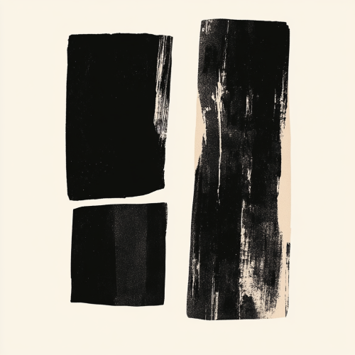an art print features a bold, minimalist composition. It consists of two large, roughly rectangular black forms on a neutral background, separated by a vertical strip of white space. The black areas have irregular, slightly textured edges, which give them a hand-painted appearance, while the white space between them acts as a stark division. The simplicity of the shapes and the contrast between black and white create a powerful visual tension, invoking a sense of balance and opposition. The piece feels rooted in abstract expressionism or minimalism, focusing on form, contrast, and the interplay of positive and negative space.