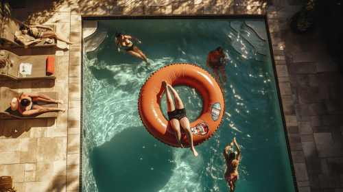hyper realistic photo, an overhead view of a pool in a house, a person is lying on an inflatable in the shape of a soda can, the inflatable is floating in the pool, other people are enjoying it around it, the situation is at sunset The situation is very well illuminated with natural light. 75 mm lens, production quality, depth of field, cinema photography, color grading, exquisite detail, sharp-focus, intricately-detailed, long exposure time, f/2.8, diffuse-back-light, award winning photography, hyper realistic, unreal engine, realistic lense flare, Cinematic Lighting, Studio Lighting, Beautiful Lighting, Accent Lighting, Global Illumination, Ray Tracing Global Illumination, Ray Tracing Reflections, Lumen Reflections, Screen Space Reflections, Anti-Aliasing, FKAA, TXAA, RTX, SSAO, Shaders , OpenGL-Shaders, elegant, 4K, --ar 16:9
