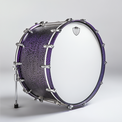Product photography of a kick drum with a blank spot for a logo on the side, featuring purple accents, a black herringbone wood outer surface, a silver metal Bauer-style bass hoop, and a white maple shell, captured under studio lighting for a hyper-realistic, high-resolution image