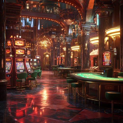 Create a hyper-realistic image featuring a luxurious casino setting. The scene should showcase a grand gaming area filled with vibrant lights, shimmering slot machines, and green felt poker tables.