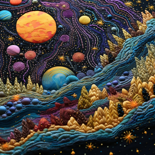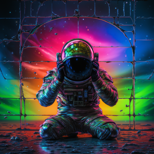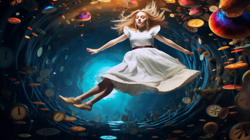 Alice falling down the rabbit hole, melting planets in the background, surreal, trippy, colorful, high contrast --ar 16:9