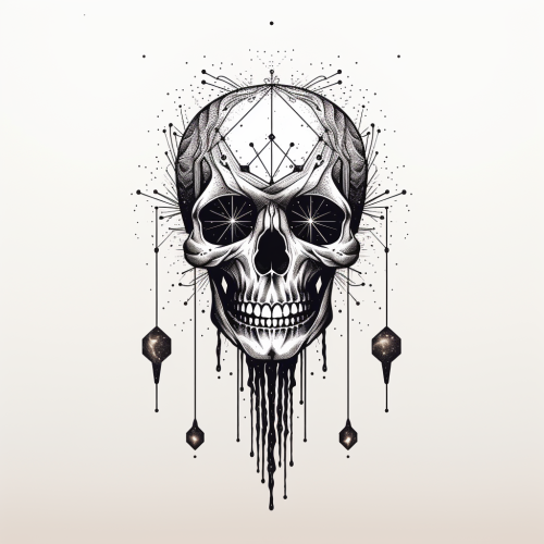Please generate an artistic image of a blackwork-style illustrated skull. The skull should be in a 3/4 profile, seemingly floating in the air with winds passing through it, creating an ethereal effect. Make sure the skull is tied with a cord and adorned with voodoo ornaments hanging from the cord. The illustration should depict a radiant light emanating from the inside of the skull, casting reflections in the eye sockets and the nose, creating a mesmerizing glow. Use a dark, high-contrast color palette to evoke a mysterious and captivating atmosphere