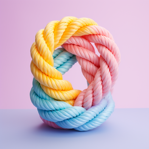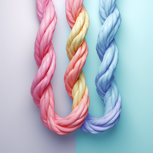 one rope made of three individual strands in different colors twisted together tightly into one rope running perfectly straight down center of image, candy colors, pastel background