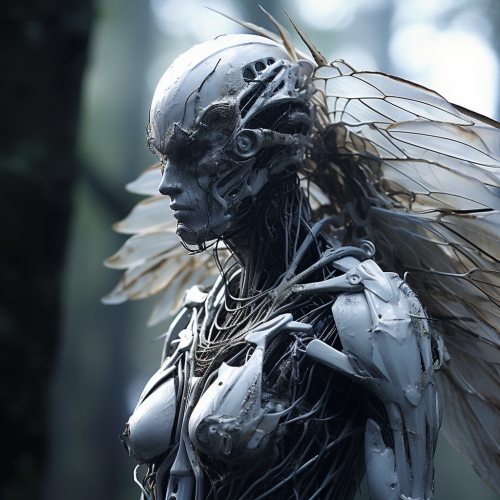 Generate photorealistic images of humanoid beings inspired by cicadas. Showcase ethereal features with translucent wings and a slender, elegant physique. The beings should have humanoid characteristics with an otherworldly touch. Capture intricate details in the wings and body, and emphasize the environmental caretaker role. Aim for a photorealistic depiction that conveys both beauty and a connection to nature. Include Jean Giraud illustration style and add faint purple bioluminescent veins on their body. --s 250 --v 5.2 --style raw