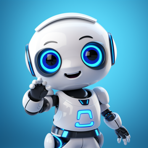 a friendly ai chatbot with one hand up using the colours white blue and black