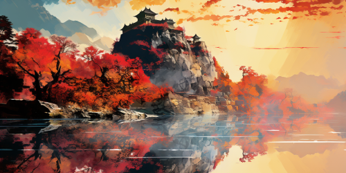 a centennial castle with donjon perched on a hanging rock next to a maple tree with red, orange and yellow leaves growing on the edge of a hanging cliff above a river valley masked by the early fog at sunrise. In the style of national geographic. Inspired by Monet, Shomei Tomatsu, Magritte, mondrian. autumn color panel. High contrast of colors. Hyper-realistic, High contrast of colors. 64K. HD, Ultra-Wide Angle, Depth of Field. Octane render, Intricate details. hyper-realistic, no signature, no label. Octane render, Intricate details. hyper-realistic, no signature, no label. --ar 64:32 --v 5.2