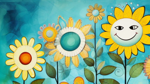 Concept: trio. Flowers with happy faces. Colors: blues, greens, yellows. Style: Illustration, clean. Whimsical, Simple, Happy. Has a background. --ar 16:9